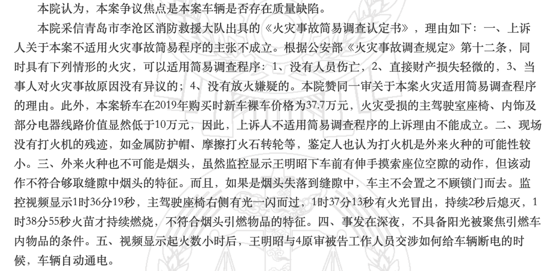 二审法院认为,根据青岛市李沧区消防救援大队出具的《火灾事故简易调查认定书》,本案轿车起火原因为电气线路发生故障引发,本案轿车存在质量缺陷。华晨宝马虽申请鉴定,但该鉴定意见不足以推翻行政主管部门以职权作出的行政认定,其主张本案车辆不存在缺陷,本院不予采信。