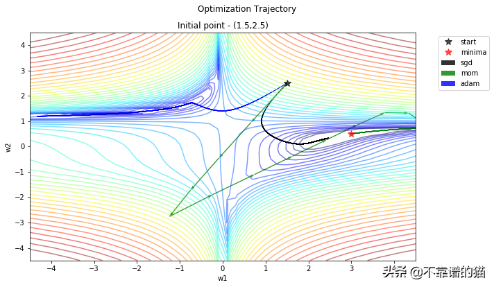 compare_trajectories(x, y, epochs, optims, lrs)初始点在优化问题中起着至关重要的作用。在这里,我们试图解决一个二维问题,与使用大型数据集和上百万个参数(维度)时找到最小值相比,这很容易。虽然我们在这里没有调优超参数,但是我们可以使用正确的超参数集有效地将优化推向正确的方向。