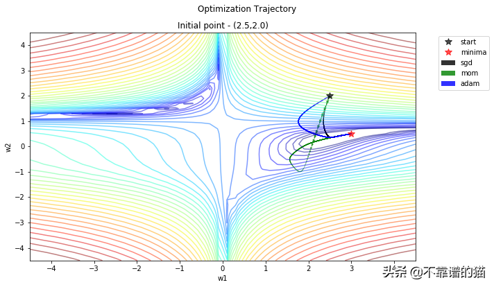 SGD— 0.0001momentum— 0.0001Adam-0.01我们将对不同算法的初始点使用相同的学习率,以保持分析的简单性,因为我们没有进行超参数调优。
