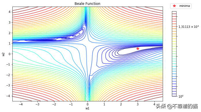 fig.tight_layout(rect=[0, 0.03, 1, 0.95])如图所示,蓝色区域表示Beale函数的值较低,红色区域表示Beale函数的值较高。最小值(3,0.5)用星号表示。
