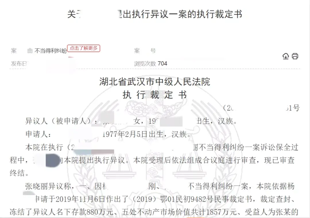 后来,因案外人小张未成年,转而,张女士又作为小张的法定监护人向武汉市中级人民法院提出异议,请求解除对信托资金和收益权的冻结。法院驳回了张女士和案外人小张对解除信托资金冻结的异议请求,但是裁定:中止对福字221号项下信托收益的执行。