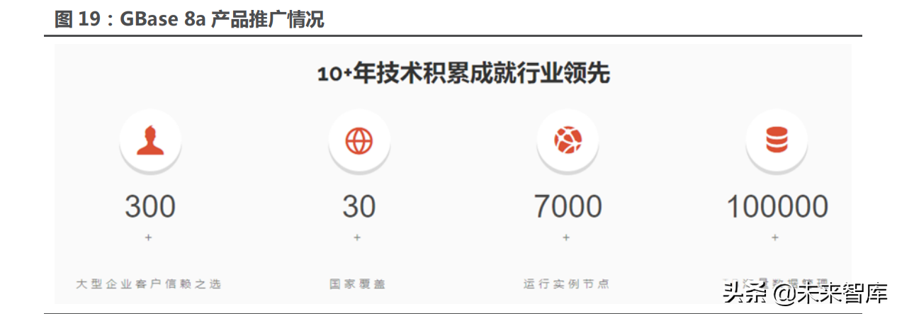 (1)GBase 8a:分析型大数据数据库(MPP)。GBase 8a 是国内分析型数 据库主导性产品,并与国外同类主流产品保持技术同步、市场同级。以大规模并行 处理、列存储,高压缩和智能索引技术为基础,具有满足各个数据密集型行业日益 增大的数据分析、数据挖掘、数据备份和即席查询等需求的能力。