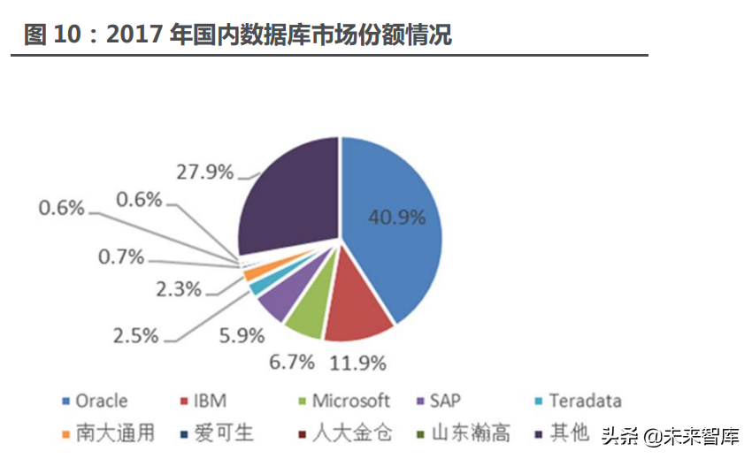 数据库国产化任重道远。安全、稳定、高效运行的数据库系统对于政企业务的 运转至关重要。当规模扩张、业务拓广、服务多元化后,有效的数据管理是政府与 企业持续发展的保证。数据库与操作系统同样作为计算机的基础软件,在中国的情 况也很相似,在数据库这个百亿级的大市场里,国外品牌占有 90%以上的份额, 霸主地位极难撼动。目前,国内数据库市场主要被甲骨文,微软,IBM 等国外厂商 垄断,国产数据库市占率极低。