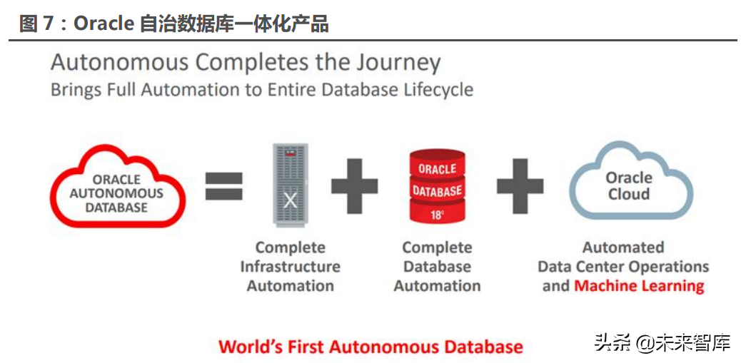 发动 AI+云技术革命,自治数据库布局未来。Oracle 于 2017 年推出自治数 据库(Autonomous Database),作为其数据库产品的革新方向。自治数据库定 位于云端的数据库产品,可以在公有云或者私有云或者混合云部署,其通过大量采 用人工智能/机器学习技术,减少人工操作,从而减少数据库的安全风险。另一方 面,Oracle 与微软 Azure 云展开深度合作,为 Azure 云用户提供自治数据库产品 服务。为实现自治数据库应用范围拓宽,Oracle 计划支持 NoSQL 和 Graph 类型 的数据库,增加对非关系型设计的支持。(报告来源:未来智库)