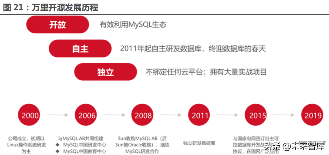 具备替换传统国外数据库的能力。万里开源拥有自主可控的数据库和拓林思 操作系统 LInux,它和深度操作系统一同入选中央正版软件操作系统采,目前已在 电力、通信等领域大面积商用。万里开源分布式数据库作为新时代的先行者,在一 体化“国网云”平台、全业务统一数据中心建设中都起到了关键作用,该数据库产 品已在国网公司各大系统中得到了应用,国家电网实现了关系数据库自主可控的 目标。