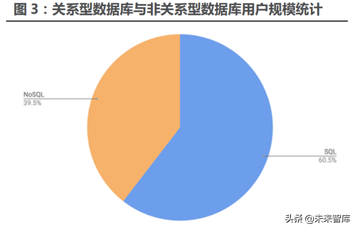 关系型数据库保持优势地位,Oracle 和 MySQL 领跑行业。根据 ScaleGrid 公司 2019 年的相关统计,关系型与非关系型数据库的用户规模分别为 60.5%和 39.5%,关系型数据库仍然占据着相当的优势。在关系型数据库中,商业化老牌王 者 Oracle 与新晋的开源新星 MySQL 优势较为明显。根据 DB-Engines 统计,两 者在近五年中始终保持领先地位,用户群体中广受欢迎。