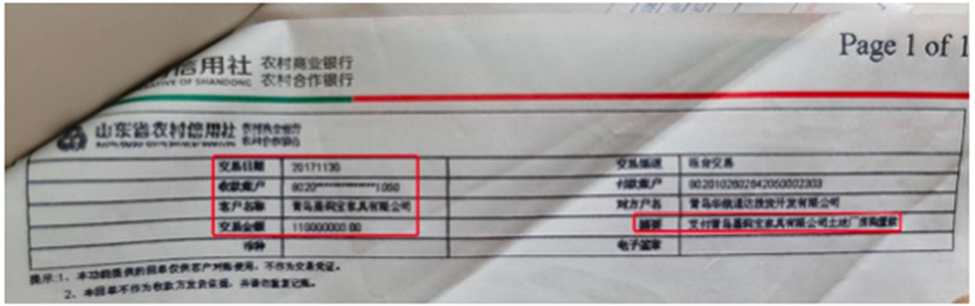 11月30日时,华航通达公司先将1.1亿元“土地厂房购置款”打入了解某公司在青岛农村商业银行的账户上。