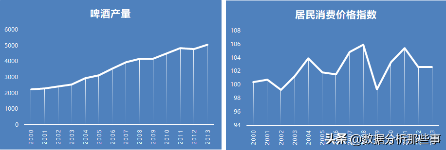 在上方的折线图中,人均GDP及啤酒产量呈现持续上升的变动趋势,这里提到的趋势其实属于时间序列的一种成分。