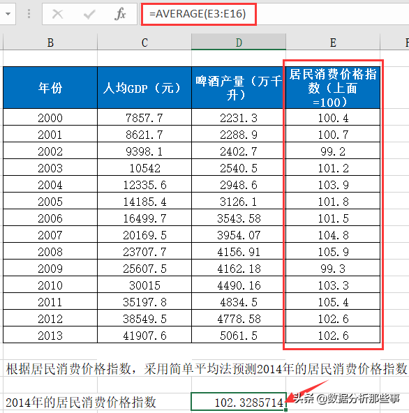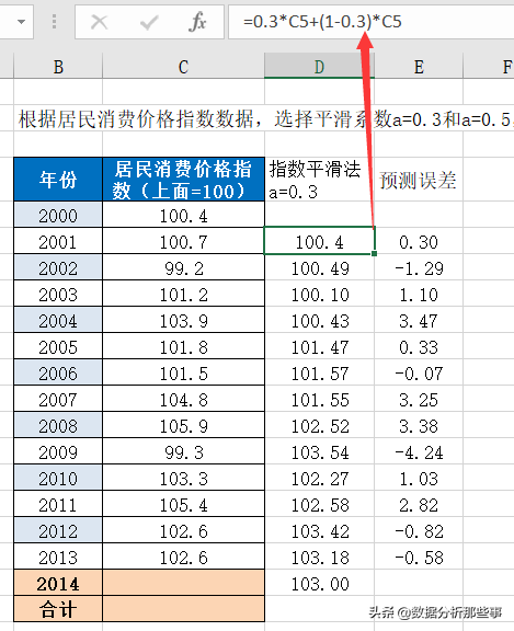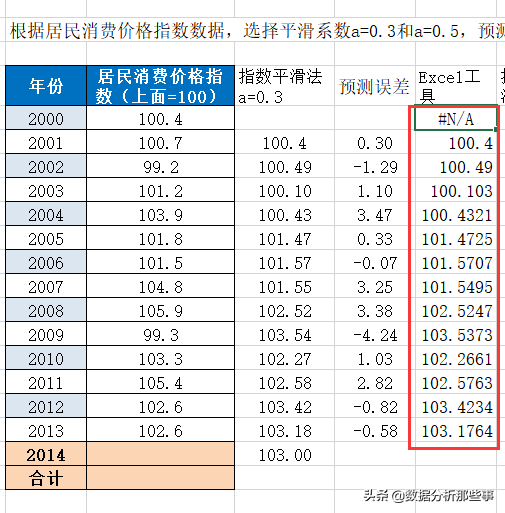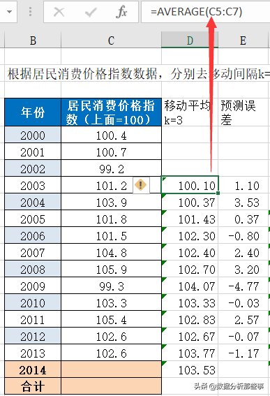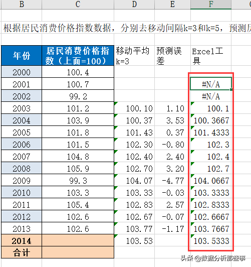 例如,针对之前提到的居民消费价格指数数据,采用简单平均法预测2014年的居民消费价格指数。