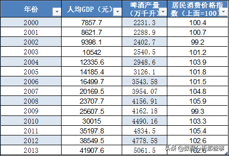 例如,下图是2000-2013年我国人均GDP、啤酒产量和居民消费价格指数的时间序列。