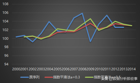 例如,根据居民消费价格指数数据,选择平滑系数a=0.3和a=0.5,预测历史各年份和2014年的居民消费价格指数,计算出预测误差,并将原序列和预测后的序列绘制成图形进行比较。