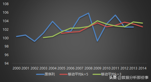 例如,根据居民消费价格指数数据,分别去移动间隔k=3和k=5,预测历史各年份和2014年的居民消费价格指数,计算出预测误差,并将原序列和预测后的序列绘制成图形进行比较。