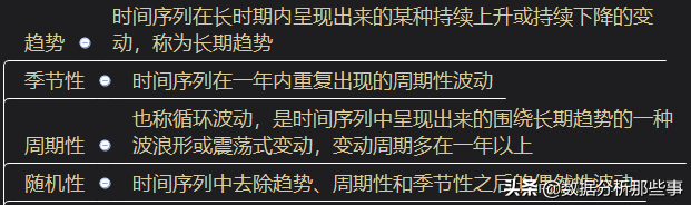 时间序列中常见的成分有四类:趋势、季节性、周期性和随机性。
