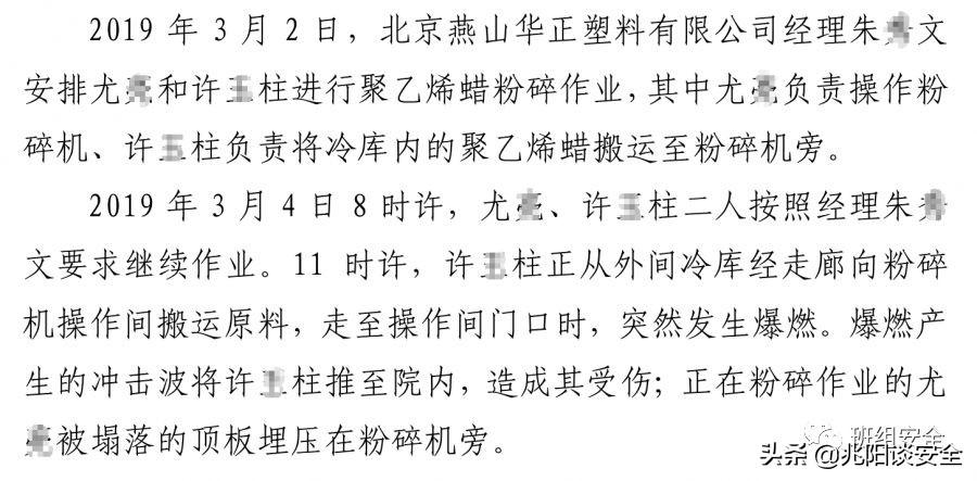 2019年3月4日11时许,北京市房山区城关街道田各庄村北京燕山华正塑料有限公司发生一起爆燃事故,造成1人死亡,1人受伤。