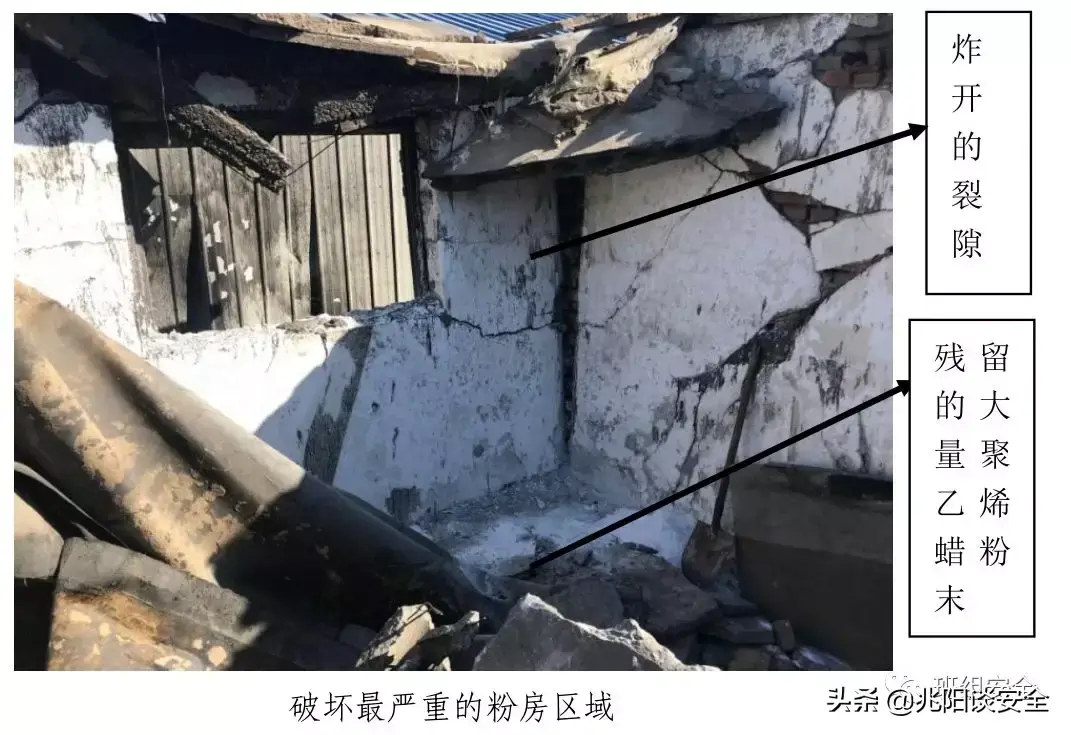根据现场勘验、询问相关人员、相关书证,专家组确认事故直接原因为:片状的聚乙烯蜡在高速旋转的粉碎机叶片作用下被粉碎,同时被正压气流沿着粉碎机底部的送粉管吹送至粉房内,粉房较密闭,粉尘在该房间内形成了高浓度的粉尘云环境;事故发生前,粉碎机内部筛网严重堵塞,导致下料不畅,物料在粉碎机内过度摩擦、受热融化并气化产生可燃蒸气,被挤压、摩擦的物料升温到一定程度发生闷燃,引燃了粉碎机内部的可燃蒸气,火焰(或火星)经由送粉管传播至粉房内引燃粉尘云,进而发生粉尘爆炸。