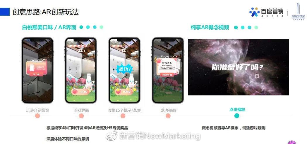 用户拿起手机,只要用手机百度的相机功能,照一照纯享酸奶的瓶身包装,即可进入AR游戏。在白桃燕麦长岛、盐花芝士海、原味牧场等场景中,用户左右晃动手机,收集燕麦桃子/芝士/牛奶,达到一定数量,即可完成游戏、获得奖励。在苹果园林场景中,用户可通过快速点击来控制角色爬树,摘到树上的3颗大苹果,即可获得奖励。