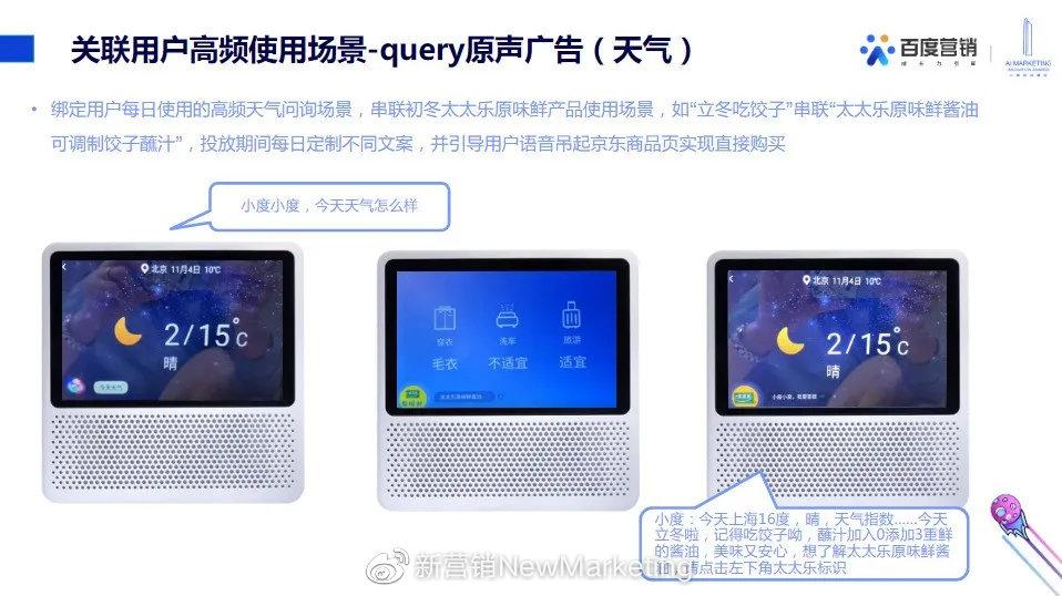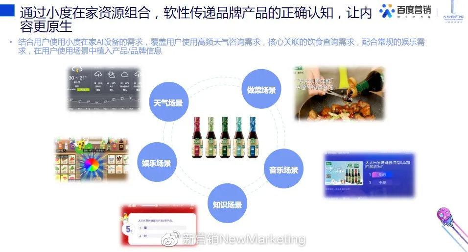 在场景营销上,太太乐打出了一套漂亮的组合拳。它通过小度在家AI设备,覆盖高频天气咨询需求,核心关联的饮食查询需求,再配合常规的娱乐需求,使太太太原味鲜酱油产品植入AI设备的各个主要场景中。