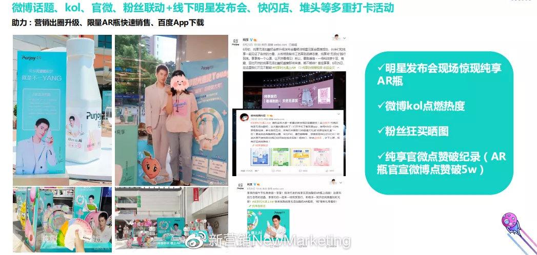 与此同时,纯享通过微博话题、kol、官微、粉丝联动+线下明星发布会、快闪店、堆头等多重打卡活动,总共收获了3.5亿的曝光量,上千万支AR瓶上架即售罄,线上H5互动游戏累计参与247万人,发放心愿礼品23万次。