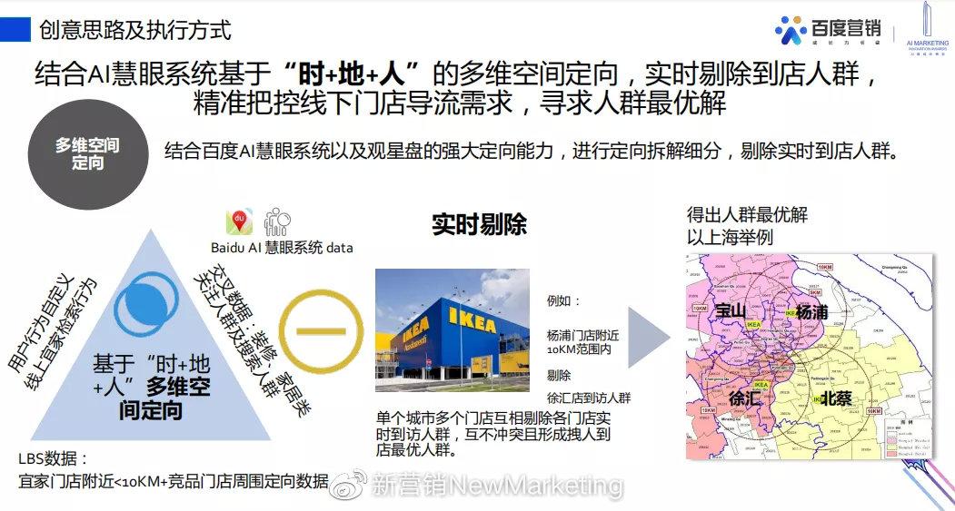 在线下门店,宜家结合AI慧眼系统基于“时+地+人”的多维空间,进行定向拆解细分,实时剔除到店人群,精准把控线下门店导流需求。例如定向发布宜家上海杨浦店的信息时,将在该门店10公里范围内,自动剔除到访上海徐汇区门店、宝山区门店的人群。这就解决了单个城市多个门店的人群到访冲突问题。
