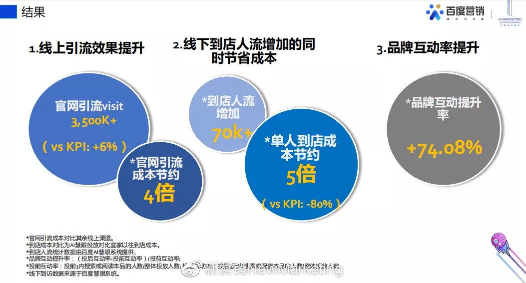通过百度的AI能力,宜家官网的引流成本节约了4倍,单人到店成本节约了5倍,品牌互动率提升了74.08%。各项数据的提升与增长表明,利用AI大数据精准投放的个性化广告能够有效打动受众,帮助宜家实现从品牌认知到喜爱,再到产生购买意向的转化。同时,多维度的人群细分,能够在最大程度上找到宜家线下门店的人群最优解,在线上吸引最佳人群并引流至最近门店。
