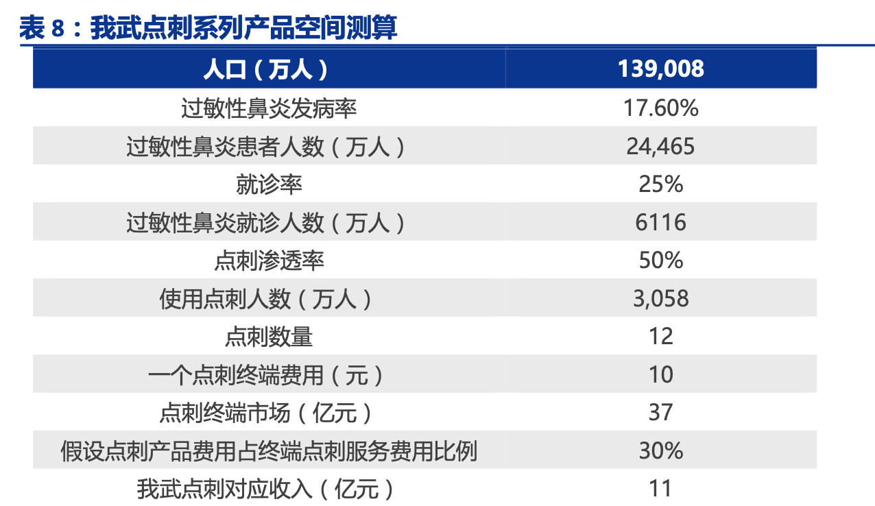 1) 假设在消费升级的大趋势下,未来人们对生活质量的需求不断提升,假设未来有 25%的过敏性鼻炎患者会选择去医院就诊,寻求规范治疗;2) 假设未来点刺成为过敏性鼻炎患者的常规检测手段,点刺检测渗透率有望得到显 著提升,此处假设达到 50%较高渗透率;3) 参考目前院内点刺产品一个点的收费,此处假设终端是 10 元一个点的收费;4) 因为点刺检测在医院终端可以以一种检测服务的方式开展,终端费用 10 元包含服 务费用等其他费用,假设我武出厂价占终端价格的 30%。另外若未来公司继续研发新的点刺产品,扩大检测种类,人均检测费用也将提升,若 数量翻倍,则公司点刺系列产品还具有翻倍增长的潜力。