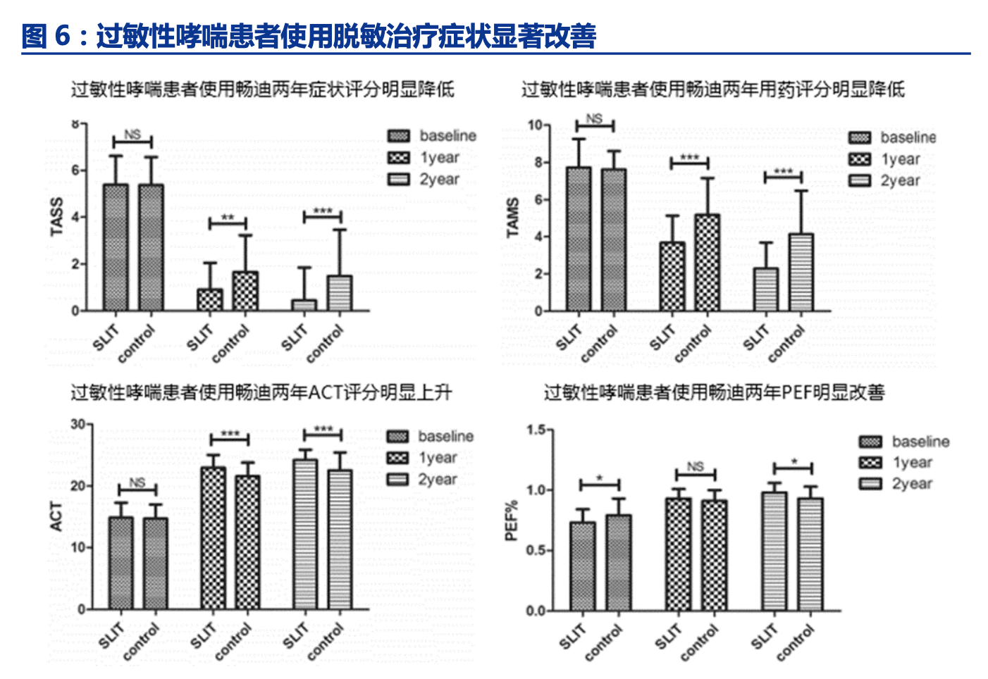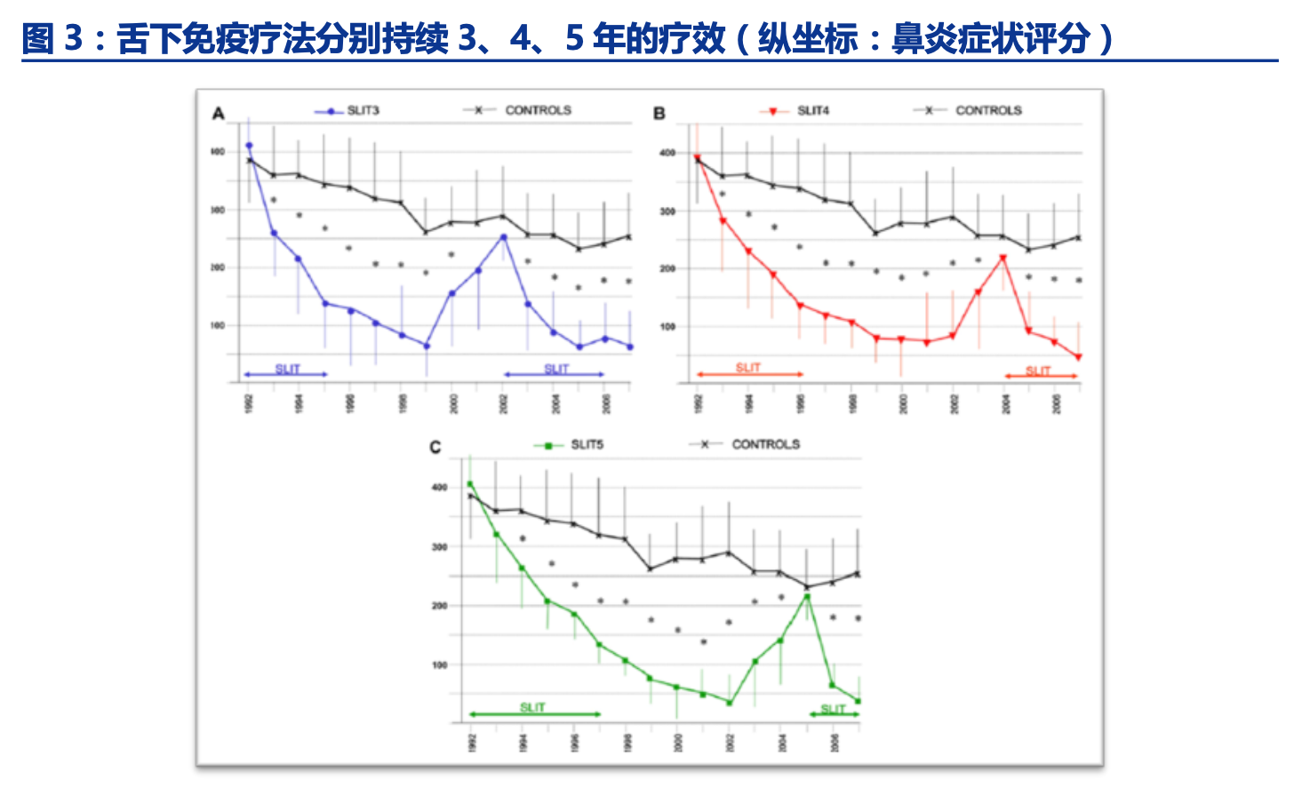 1、可以让患者达到长期缓解状态。2015 年意大利进行了一项 SLIT(舌下特异性免疫 治疗)长期疗效的研究,分别给予患者进行 3 年、4 年、5 年的脱敏治疗,停药之后发现, 进行 3 年脱敏治疗的患者在之后的 7 年都能很好的控制过敏症状,4 年和 5 年 SLIT 能够给 予患者 8 年的长期疗效,即使之后有反弹,重新开展脱敏也可让患者快速获得临床疗效。