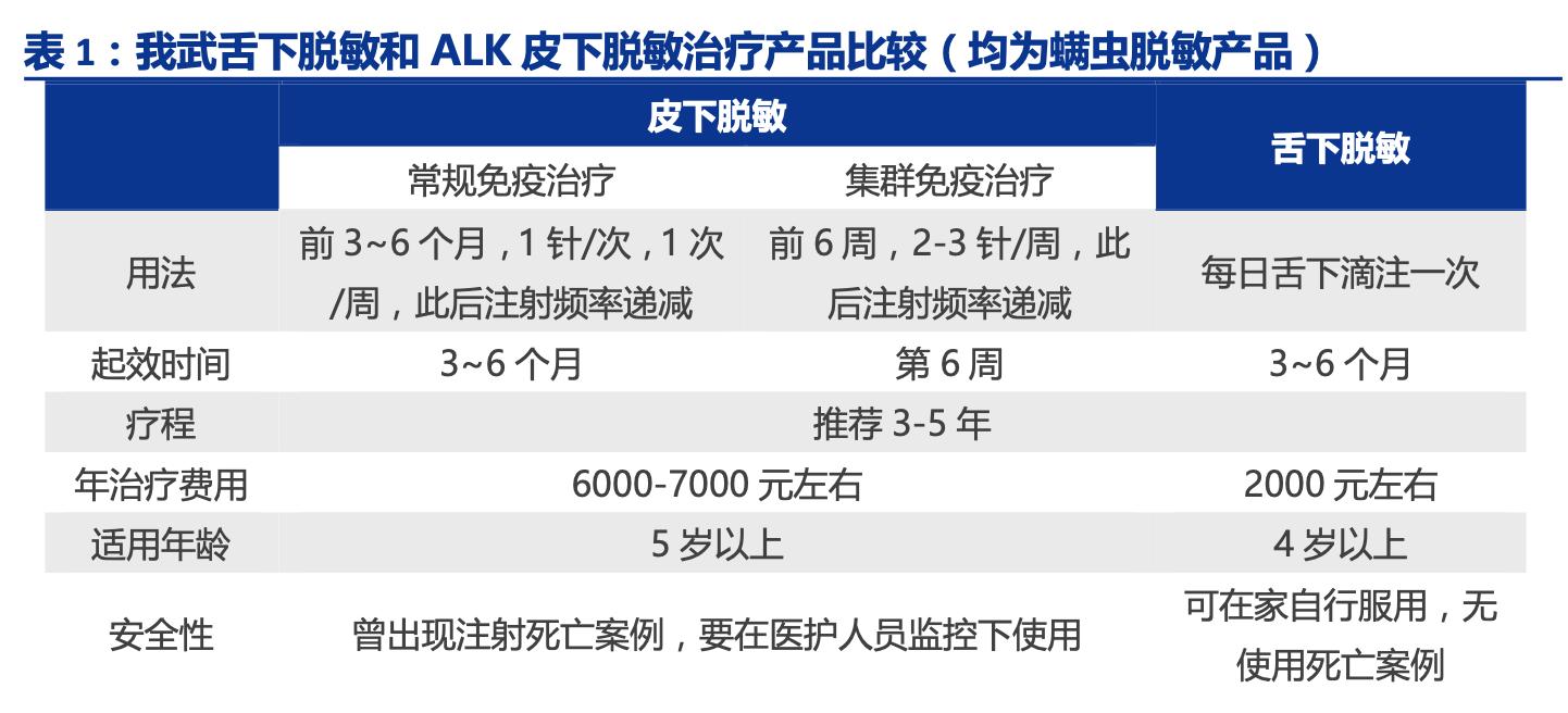 舌下脱敏较皮下脱敏有诸多优势。脱敏治疗按照给药方式,可分为舌下给药和皮下注 射给药,国际上最早开展的是皮下脱敏治疗,距今已有近百年的治疗历史;舌下脱敏治疗 则直到 80 年代左右才开始有相关的临床研究开展。舌下脱敏主要是通过口腔黏膜给药,使 得患者逐渐实现免疫耐受。舌下脱敏安全性高,给药方便,患者可自行带回家中使用,而 皮下脱敏存在一定的安全隐患,在历史上曾出现过因严重过敏反应导致的死亡案例,使用 上也不便利,需要患者定期前往有皮下脱敏治疗资质的医院进行治疗。另外由于脱敏治疗 目前并未进入国家医保,费用也成为患者选择的一个考虑,皮下脱敏治疗费用是舌下脱敏 的 3 倍左右;从国内外的市场趋势来看,舌下给药是未来主要的发展方向。