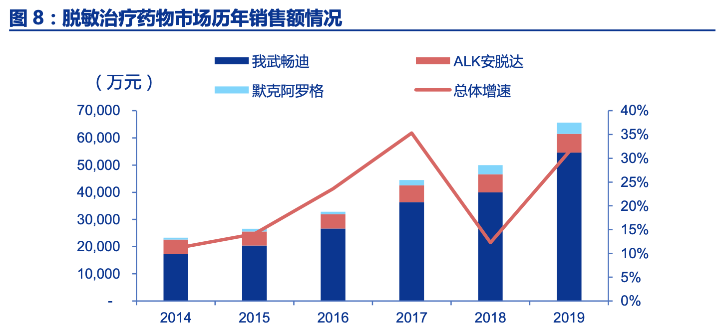 我武生物成立于 2002 年,在 2002 年前后的这段期间,国内脱敏治疗市场正经历一段 无序到有序的特殊历史转变时期,在 1999 年国内第一个标准化的皮下脱敏制剂获批之前, 脱敏治疗前 50 年仅限以医院制剂的形式在院内使用,并未得到广泛推广。自 1999 年之后, 国内脱敏治疗市场逐步规范化,包括 2001 年中国医学变态反应学会的成立,2003 年 CFDA 颁布的首部脱敏制剂质量控制技术指导原则。2004 年国内又批准了第二个标准脱敏制剂的 进口。我武自主研发的粉尘螨舌下滴剂也在 2006 年获得国家药监局的正式批准。可以说在 1999 年到 2006 年这 7 年中,国内脱敏治疗市场实现了从空白到初步发展的转变。经过近 10 多年的发展,我武凭借舌下脱敏治疗的诸多优势,成为国内脱敏领域的主要市场占有者。