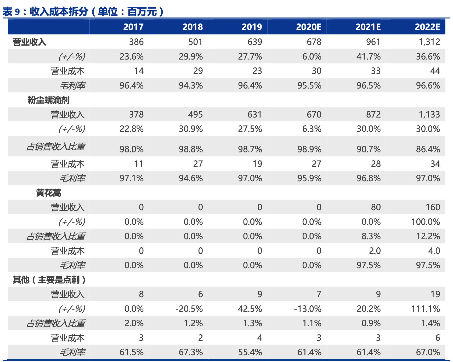 黄花蒿滴剂:2019 年正式报产,预计 2021 年获批上市,假设年治疗费用是 8000 元, 第一年预计有 10000 万名患者使用,第二年患者数翻倍,预计 2021 年和 2022 年黄花蒿 滴剂收入分别为 8000 万和 16000 万,由于价格高于粉尘螨,预计毛利率比粉尘螨高,假 设 2021 年和 2022 年毛利率均为 97.5%;