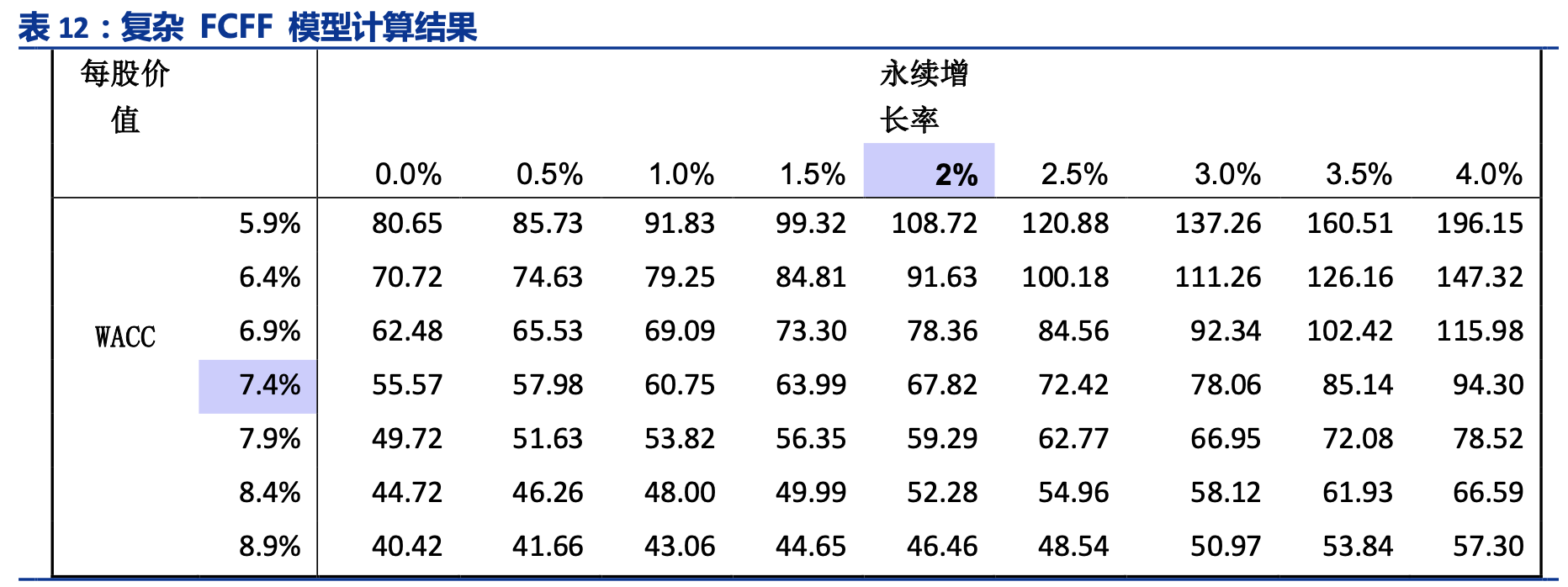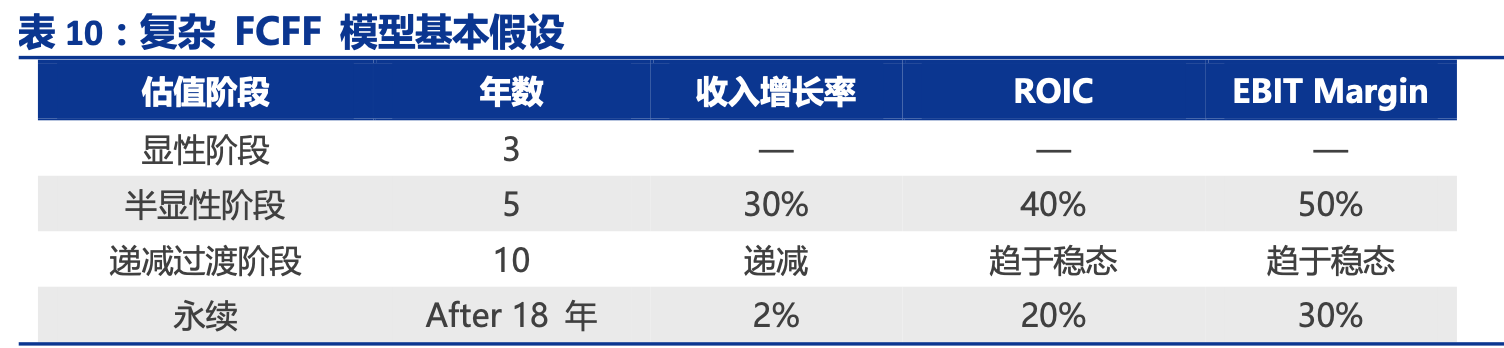 在使用公司整体的自由现金流进行复杂 FCFF 模型测算时,我们对该模型的各种参数 做了如下假设: