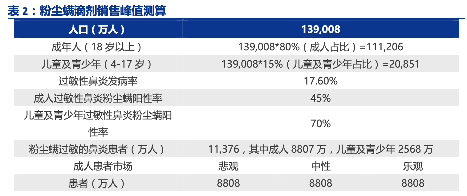 2.3 预计粉尘螨滴剂销售峰值有望达到 60 亿元左右