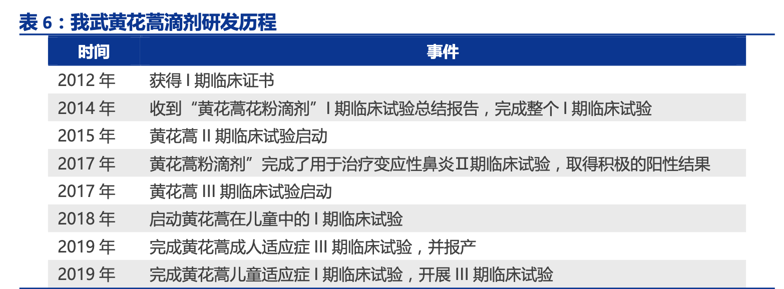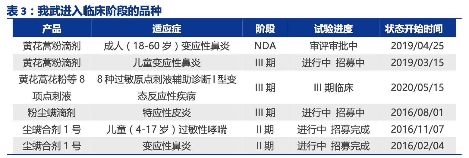 公司从 10 年前便开始布局黄花蒿滴剂的研发工作,经过近 10 年的时间,公司于 2019 年 4 月将黄花蒿滴剂用于成人过敏性鼻炎患者的脱敏治疗的适应症申报上市,并于 2020 年上半年完成了儿童患者的 III 期临床试验入组,预计成人适应症将于 2021 年年初获批, 该产品的上市可极大解决北方花粉过敏患者的需求,也是公司继粉尘螨滴剂之后的第二款 大产品。目前市场上暂无同类产品获批上市,也无同类产品开展临床试验。鉴于过敏性鼻 炎的临床试验较为复杂,历时较久,我们预计我武黄花蒿滴剂在未来 7-8 年内不会出现同 类竞争者,可独享花粉脱敏市场。