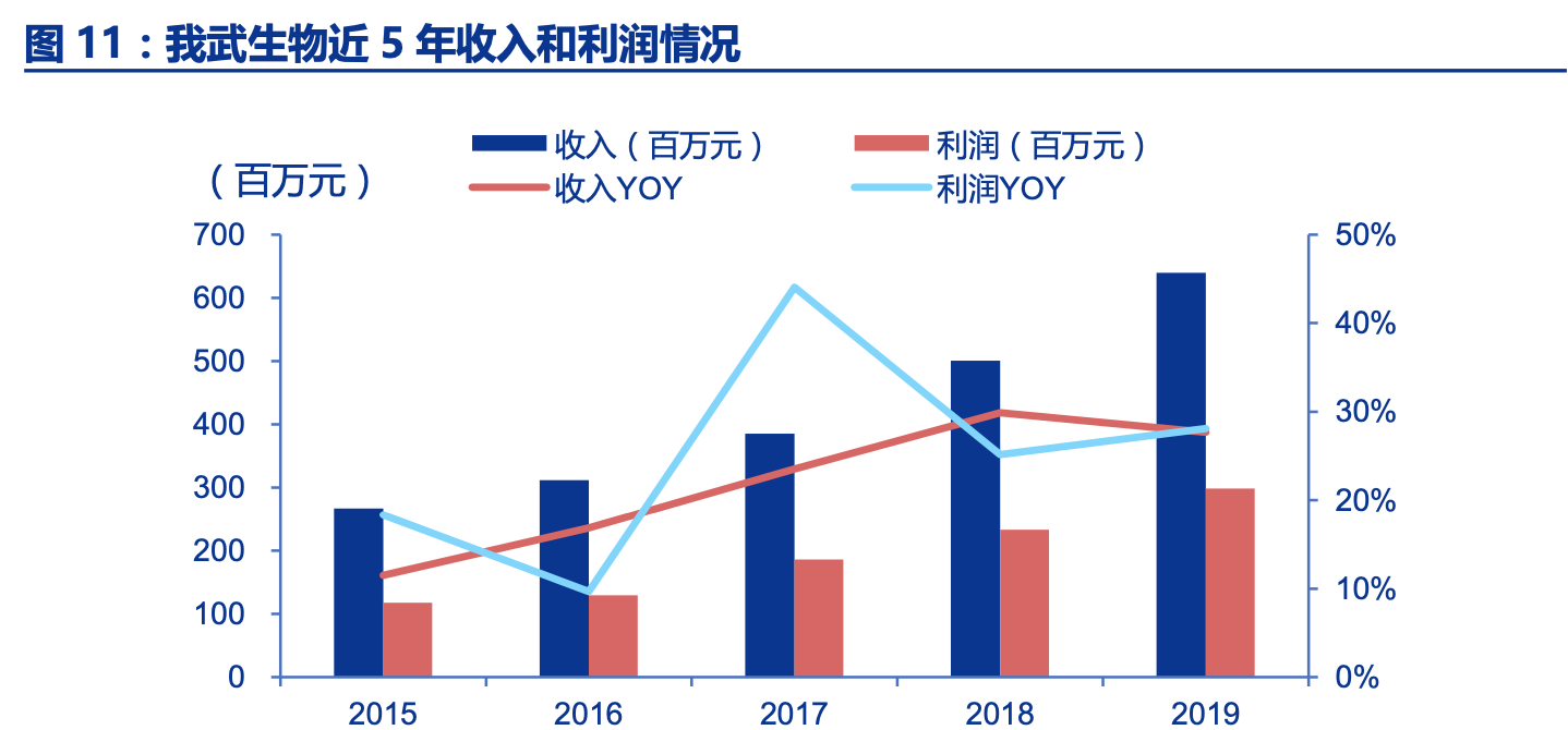 我武生物过去三年的 ROIC 分别为:26.63%、26.3%、25.55%,并且过去三年净利润的增速分别为:28.09%、25.14%、44.04%,表现出比较好的投资回报率和净利润增速,今天一起了解下这家公司的详细情况。