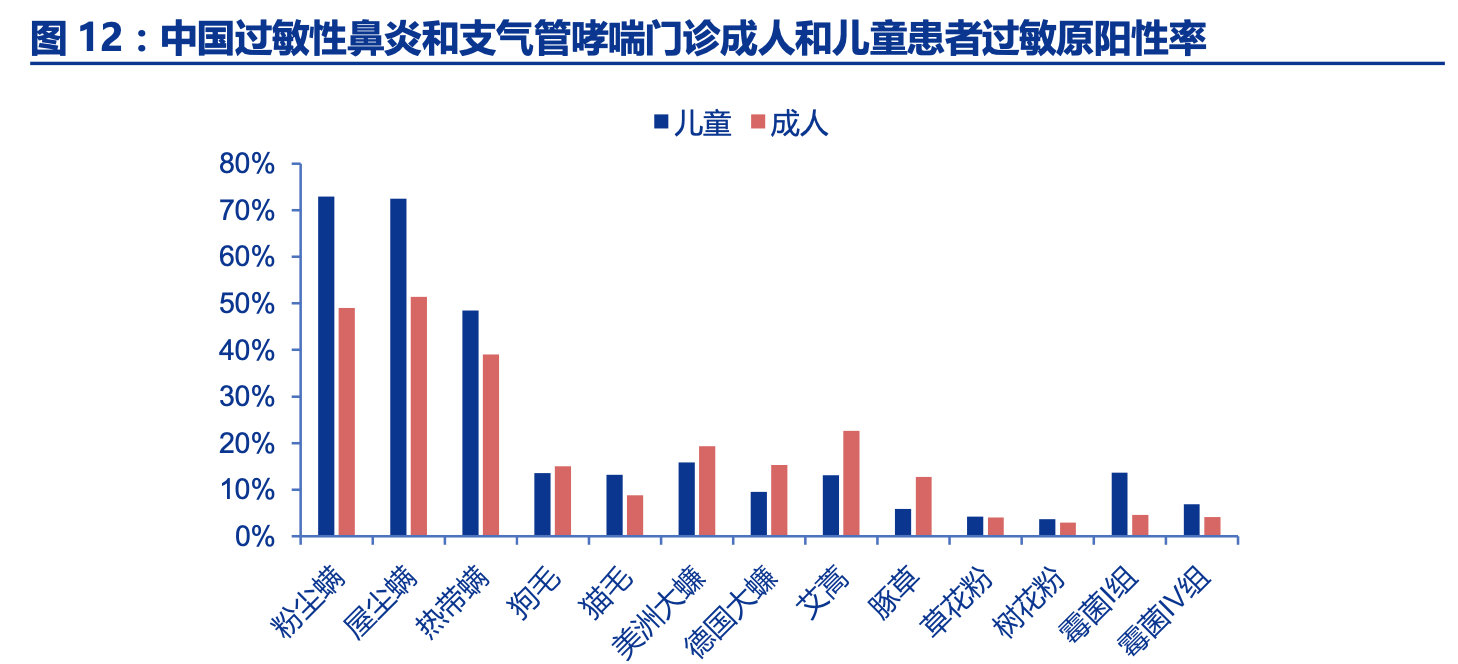 粉尘螨是过敏性鼻炎第一大过敏原。根据《中国过敏性鼻炎和支气管哮喘门诊患者变 应原的多中心临床调查》显示,螨虫过敏性鼻炎的第一大过敏原,儿童中的占比更高,达 到近 70%的比例,成人大概在 40%左右,因此国内目前获批的 3 款脱敏治疗产品均是针对 螨虫过敏的患者,按照过敏性鼻炎近 17.6%的发病率测算,螨虫脱敏治疗的终端患者人数 可达 1 亿多人。