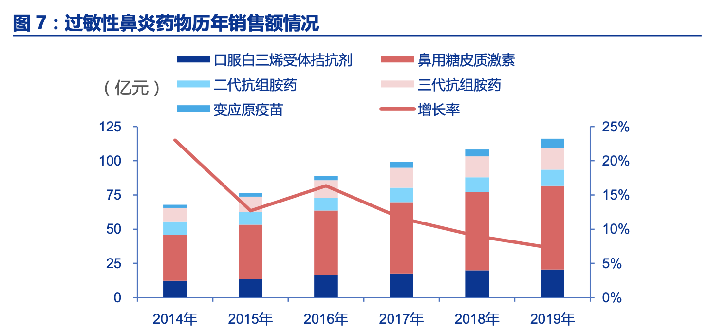 国内过敏性鼻炎市场已达百亿规模,但脱敏治疗占比不足 10%。根据南方所公立医院 放大数据显示,国内过敏性鼻炎药物市场规模从 2014 年的 68 亿快速增长至 2019 年的 116 亿,5 年复合增速 11.3%。细分板块占比最大的是鼻用糖皮质激素,占比超过 50%,是目 前过敏性鼻炎药物治疗市场的一线推荐用药。