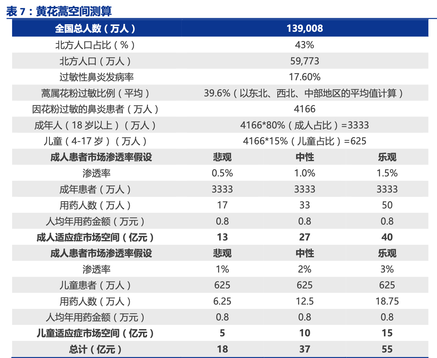 1) 黄花蒿滴剂的市场主要在北方。南方空气湿度大,花粉季空气中的花粉含量并不高, 因此在秋季不易引起花粉过敏,因此人群测算基数以北方人口为主;