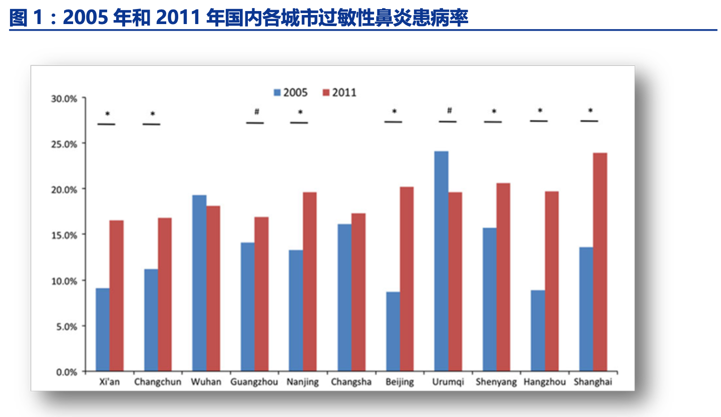 变应性鼻炎患病率高,且呈上升趋势。据统计全球有超过 5 亿人患有过敏性鼻炎,欧 洲约有 1 亿人患有过敏性鼻炎。在我国,过敏性鼻炎的发病率呈明显的上升趋势,2005 年 的流行病学数据显示成人过敏性鼻炎患病率为 11.1%,而 2011 年的流行病学数据则显示 患病率上升至 17.6%,以此计算预计终端有 2.4 亿患者。