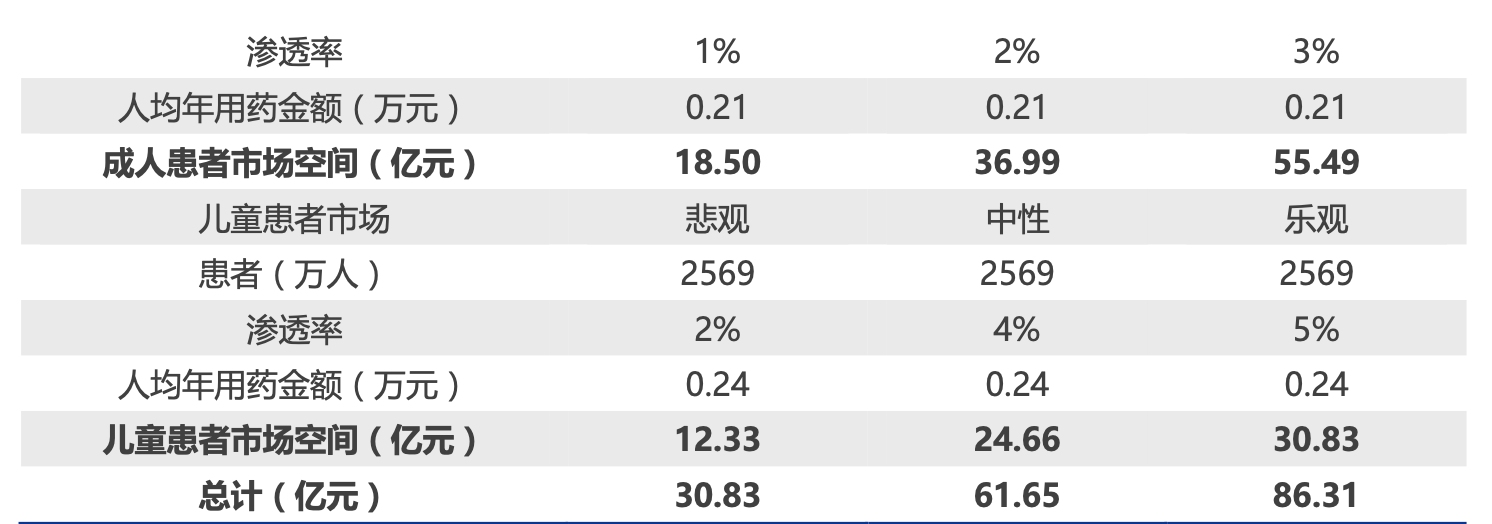 4) 儿童渗透率是成人的 2 倍。此处假设和粉尘螨的假设类似,一般大众对于儿童过 敏症状更加关注,就诊率治疗率也将高于成人患者,因此给予黄花蒿滴剂在儿童患 者中更高的渗透率。