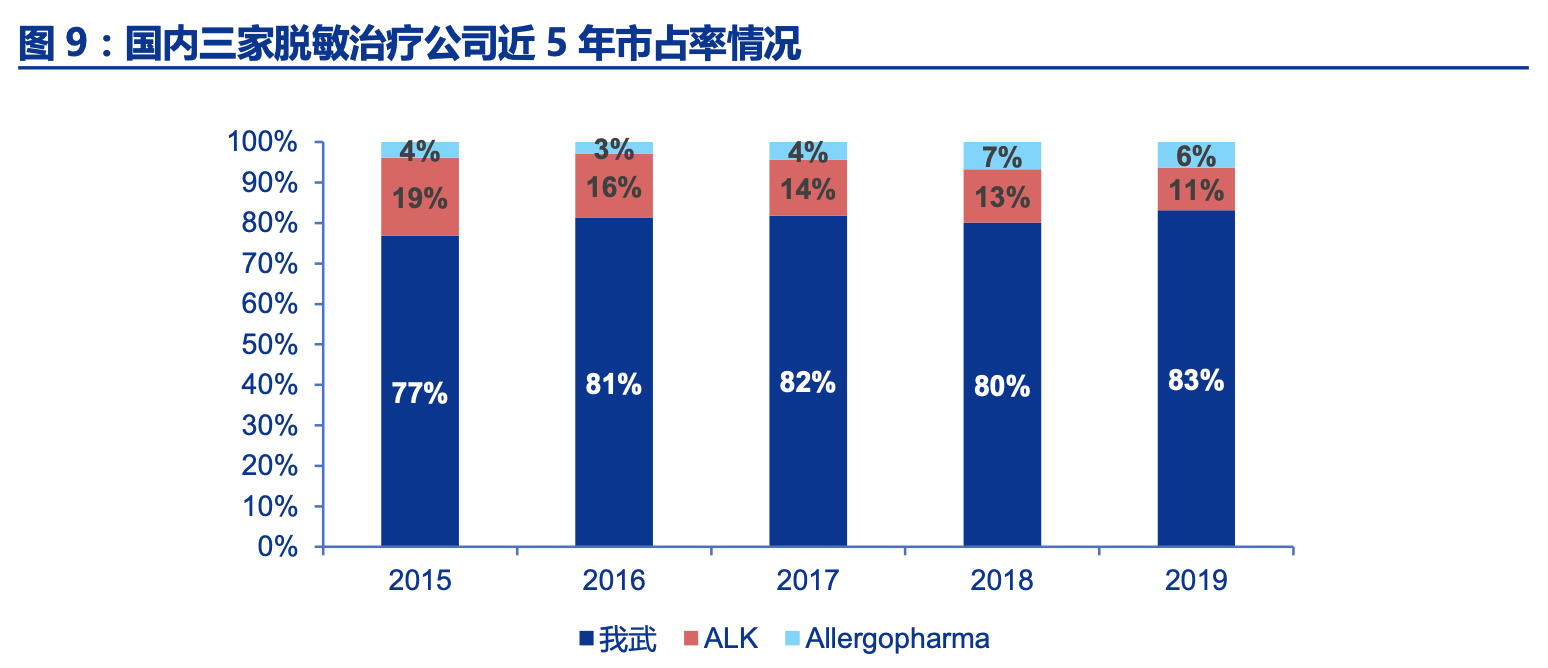 我武生物是国内舌下脱敏治疗独角兽,占据国内脱敏治疗市场主要份额。目前国内脱 敏治疗市场竞争格局良好,仅有三家企业,分别是国内的我武生物、丹麦的 ALK 公司以及 德国的 Allergopharma,三家的产品均为针对螨虫引起的过敏性鼻炎的脱敏治疗,ALK 和Allergopharma 均为皮下脱敏制剂,我武生物是国内唯一一家生产销售舌下脱敏制剂的企 业,目前市场份额最大,占据国内脱敏治疗市场 80%以上市场份额。