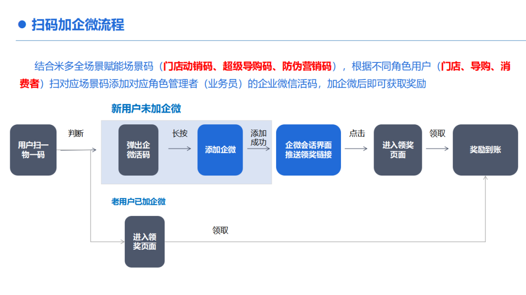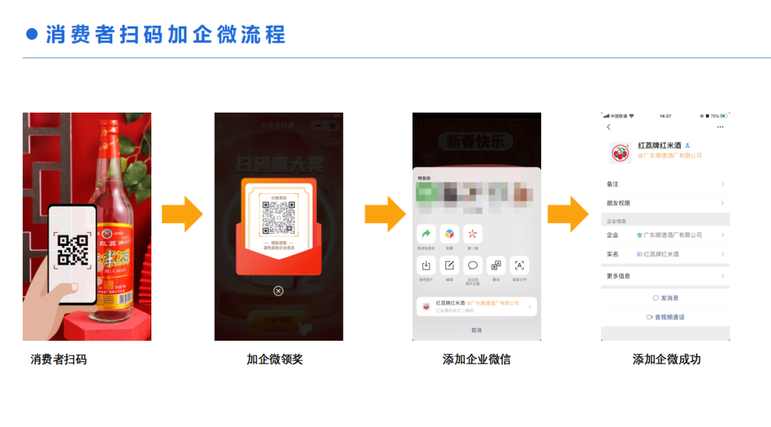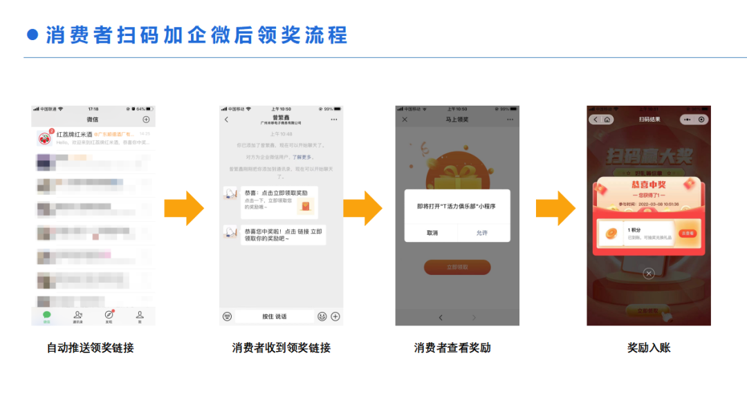 用一物一码在产品上赋码,通过扫码发奖作为引擎策略,吸引用户扫码,用户扫码后添加企业微信,企业微信会自动发送链接让用户领奖。通过扫码领奖一方面带动产品动销问题,一方面从公域平台夺回话语权,有效维护长远而忠诚的客户关系。