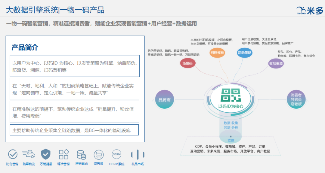 而基于产品包装的一物一码是品牌商最容易实现、最基础、应用最广泛、也是最容易产生效果的一种在线化营销技术。通过一物一码,在满足产品防伪、防窜货、溯源、扫码营销等刚性需求的同时,能够实现品牌商与消费者的直连与信息传达的高度畅通,快速完成千万级用户数据抓取与储存,建立起品牌商完整的用户账户体系,为用户深度运营做好铺垫并提供数据支撑。