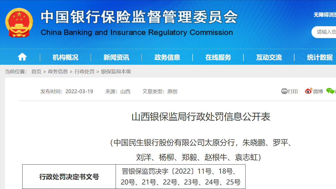 近日,山西银保监局加大了银行业违规检查力度,中国民生银行太原分行领到罚单。六项违规案由,被罚款1710万元,并责令改正。多名责任人员被取消任职资格,并给予警告。
