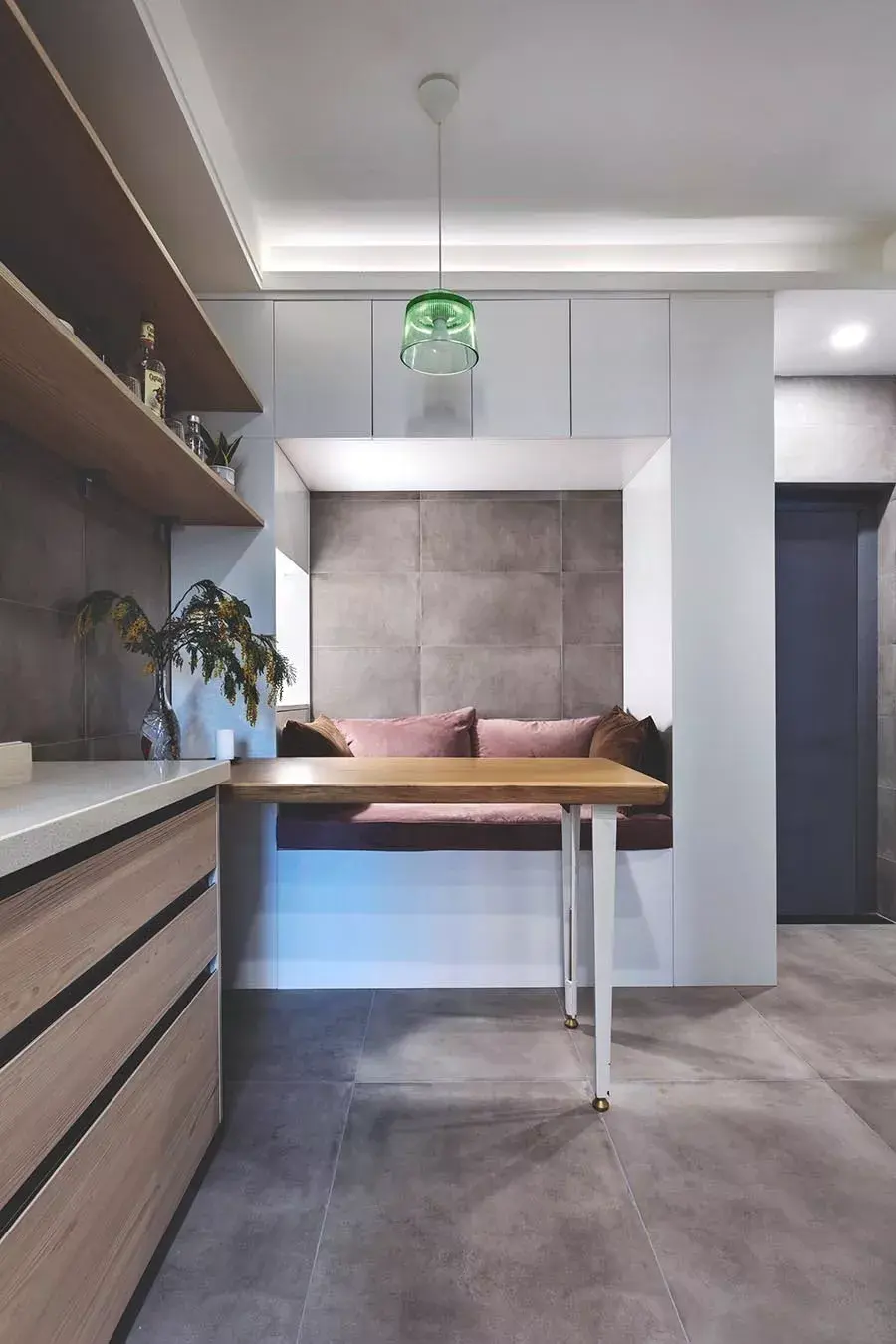 由于本案仅有36平方米,为了复原公共场域应有的功能,采取客厅、餐厅合而为一的复合式规划,藉由卡座设计营造类似沙发的作用;其次,借着厨房台面顺势延伸出餐桌,并安排在卡座前,让这处空间马上具备了工作、用餐、宴客、休憩等多种功能。