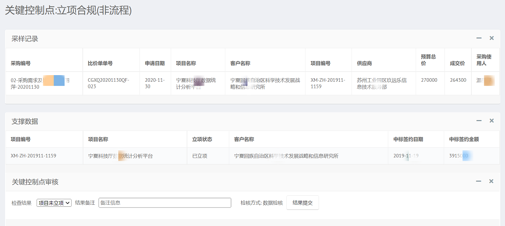 该页面主要实现采样记录对具体关键控制点的校核审计功能,该页面包括三部分:1、采样记录部分,该部分为选中的采样记录描述部分,具体可包含采购请求编号、比价单单号、申请日期、项目名称、客户名称、项目编号、供应商、预算总结、成交价、采购使用人等字段;2、支撑数据部分,该部分为与采样记录挂钩的项目信息表记录,具体可包含项目编号、项目名称、立项状态、客户名称、中标签约日期、中标签约金额等字段;3、关键控制点审核部分,该部分可按人工或数据检核方式,核查控制点审核内容,并填报检测结果及备注。