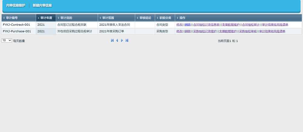 上页截图主要实现内审信息维护功能,内审信息可包括审计编号、审计目的、审计年度、审计范围、审计结论等字段。内审记录可进行抽样记录维护、支撑数据维护、抽样记录审计等操作;