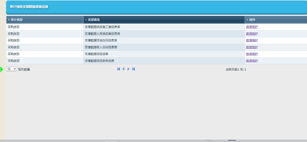 上页截图主要实现支撑数据维护功能,参照第六节“基础工作方案案例”介绍,采购审计的支撑数据包括供应商工商信息表、入库供应商信息表、支出合同信息表、收入合同信息表、项目信息表、项目财务信息表。可对以上支撑数据表的记录进行增、删、改维护。