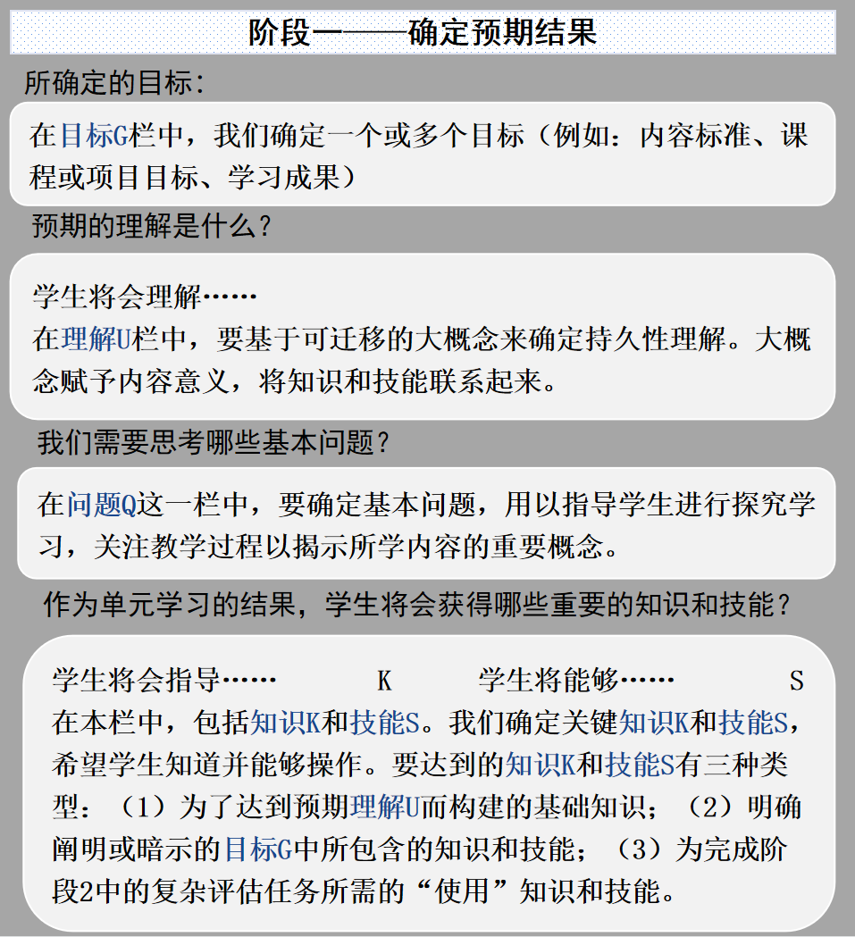 学生应该知道什么,理解什么,能够做什么?什么内容值得理解?什么是期望的持久理解?教师必须在第一阶段明确学习内容的优先次序,明确“学生理解”的目标。
