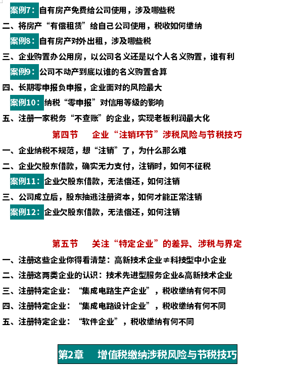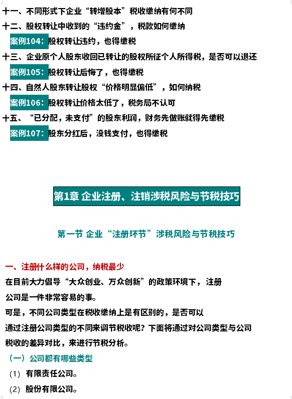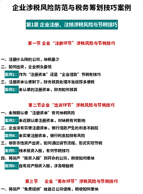 还好最近我们老板花了大价钱挖来一个财务总监,人家一来就汇总了107个税务筹划案例,共分为五大部分,非常的详细,包含了企业注册注销环节的筹划、企业所得税缴纳方面的筹划、个人所得税缴纳方面的筹划、增值税方面缴纳方面的筹划、投融资方面的筹划五大部分,非常具有参考价值,大家可以来瞅瞅看~