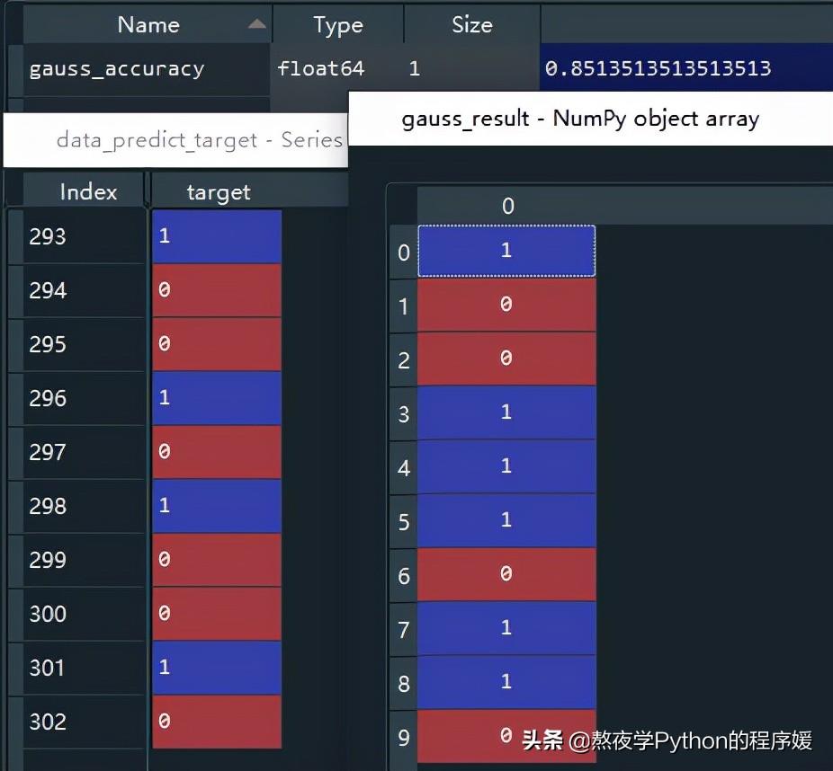 #(4)高斯模型训练 # 导入朴素贝叶斯--高斯模型方法 from sklearn.naive_bayes import GaussianNB # gauss_nb接收高斯方法 gauss_nb = GaussianNB() # 模型训练,输入训练集 gauss_nb.fit(x_train,y_train) # 计算准确率--评分法 gauss_accuracy = gauss_nb.score(x_test,y_test) # 预测 gauss_result = gauss_nb.predict(data_predict_feature)导入高斯模型方法,gauss_nb接收该方法;使用.fit()函数进模型训练;采用.score()函数用评分法查看模型准确率,根据x_test预测结果,把结果和真实的y_test比较,计算准确率;最终将验证集的特征值传入.predict()函数预测是否得了心脏病,将最终预测结果与真实值比较,发现有少许偏差,模型准确率在0.83左右。