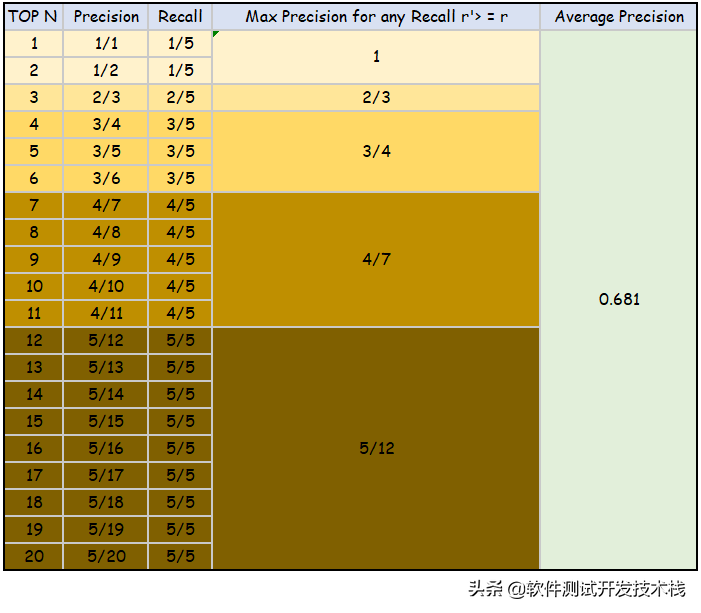 如上,这是一张排过序的Score,如图所示Top-20中,1、7、11、14、19为正样本,从上往下,当Top-N变化(调整阈值实现Top-N变化),Precision也随之线性变化,当遇到正样本时,Recall才变化,遇到负样本时,Recall不变,当前最大Precision也不变,相应的Precision-Recall曲线(这条曲线是递减的)如下 。